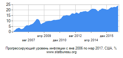 По инфляции в США взял данные с ресурса https://www.statbureau.org. По этим данным уровень инфляции доллара за 11 лет составил 22,68%. Или в среднем 2,06% ежегодно. Округлю и возьму за основу в расчетах цифру 2,1%.